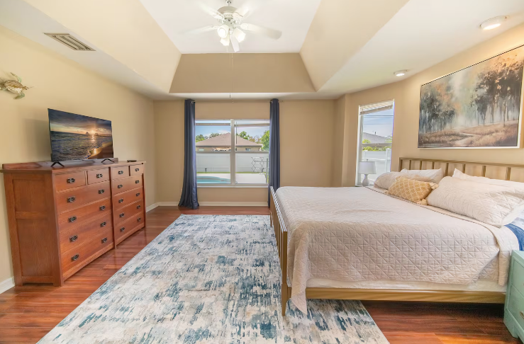 The whole group will have easy access to everything from this centrally located home. Enjoy the privately fence backyard and heated pool & spa. The home has a nice open concept great for family/friend gatherings. Large master suite with his and her sinks, new smart Roku TV's with streaming capabilities. Contactless checking for convenience.